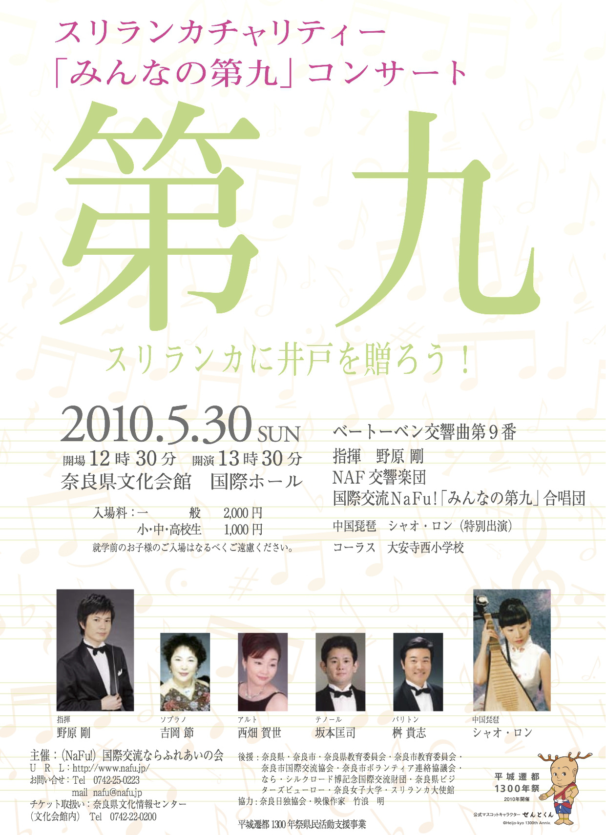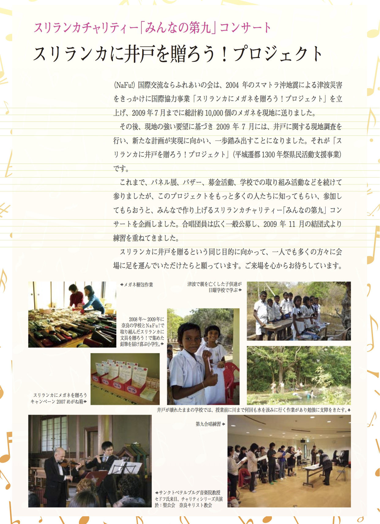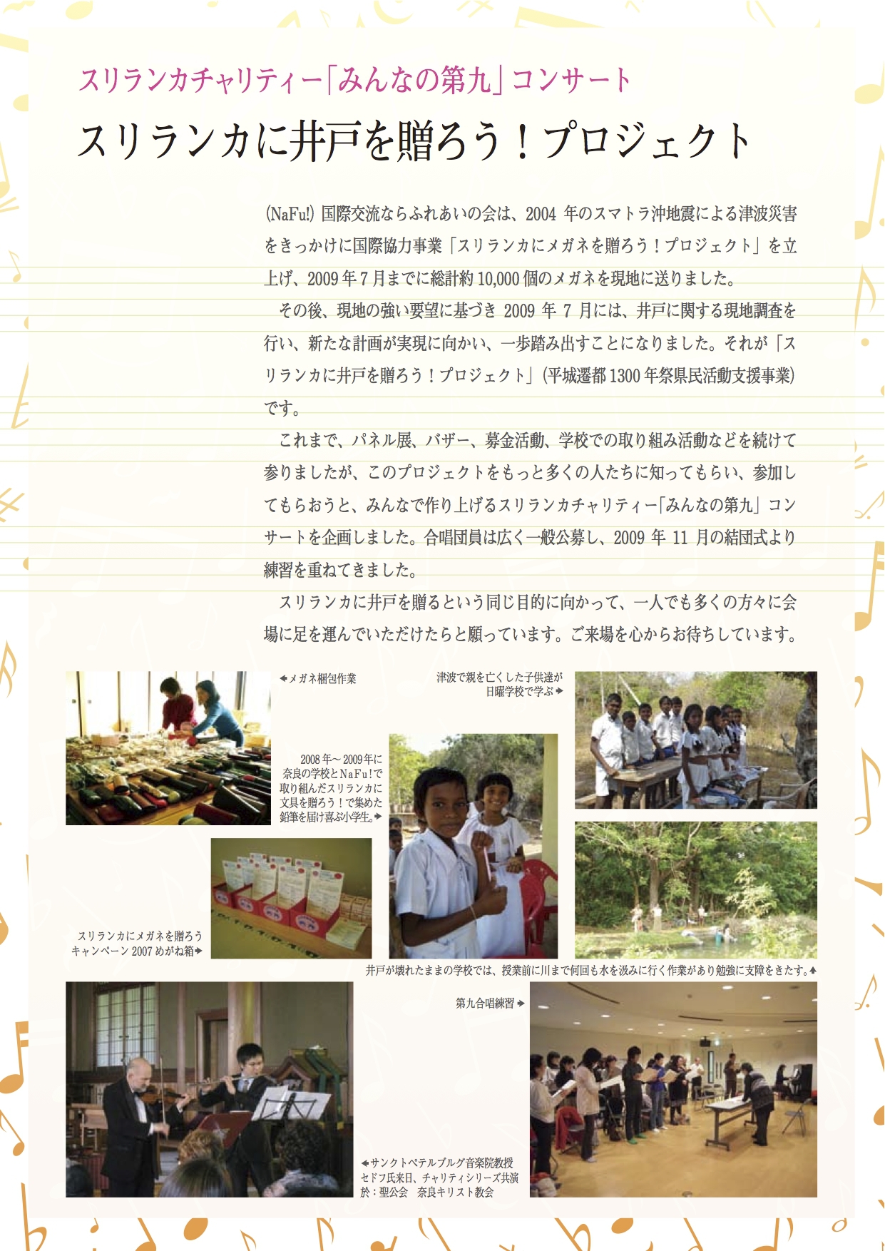 - 困窮するスリランカの学校を助けたい一心で「NaFu!スリランカに井戸を贈ろう!プロジェクト」は、実際に現地を視察し現状を持ち帰り市民レベルでこの問題に如何答えるか?・・・考えた。何も基盤のない小さな会だが、協力協働を呼び掛け総力で行動してゆくことを一同で決心し、日本奈良では、平城遷都1300年記念県民行事としてスリランカチャリティコンサート「みんなの第九」(会場約1000人)開催を実現し繋いだ。 多くの市民や学校、団体が賛同し協力の手を差し伸べ、その後もスリランカ国を理解する勉強会やバザー、文房具回収活動、もったいない運動、生活や文化にふれる活動を併せて協力支援活動として拡がった。県民の国際協力への意識が深まり、協働が高まりスリランカへの募金活動が35万円に達したとき、井戸の発注に至り、調査から2年目を迎えていたが、井戸掘り工事が始まった。その後洪水などで遅れも有ったが、井戸は下見調査から3年目の2012年7月に完成した。追加費用として10万円を要し、合計一基45万を井戸費用として寄付した。
