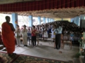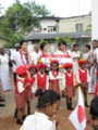 - 民族舞踊団が歓迎の舞を踊りながら学校の方向に進んでゆく。コンピューターで国内で優勝したという男子生徒が混じっているそうで、勢いよく激しい踊りに一行は驚いた。女子は華麗に私たちを見つめて民族舞踊を踊り歓迎した。横長の民族太鼓と踊りに誘われ校庭に入っていくと、村中から人々は集まり、校庭にはぎっしり整列した900名の生徒たちがNaFu!一行を待っていてくれた。校庭演題に、生徒の喜びの感謝のスピーチが入れ替わりあった。以前聞き取り調査で熱心に訴えていた女子もいるのだろう。2009年に下見調査のレポートを日本に持ち帰り、県内外に一斉に当会のプロジェクト計画を呼びかけ活動が始まったが、晴れて今日の日を迎えることができ、ダンミカ僧侶もNaFu!一行も感涙した。実は、ダンミカ長老は夜中の3時にコロンボを発ちこの井戸除幕・贈呈式に駆けつけて下さった。ダンミカ長老や微笑む生徒たちの姿をみて、こころから「良かった。」とNaFu!の活動を振り返った。2009年調査の際、「この学校の井戸掘りは、浅かったので失敗の井戸でした。」「井戸計画があって出来上がったのだが、今は動かないし水がでない。戦争でその修理も約束したが中止のままになり、誰も来ない。」「水汲みは朝早くからで勉強を妨げる。」など、校長先生たちはじめ学生たちが、水(井戸)が必要でその大切さを訴えていた、3年前の姿を思い出した。
