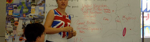 お上手な日本語で、ブラジルという国名が、PAU-BRASILという木の名前から由来しているお話、国旗中央の帯の中に書かれた「ORDEM E PROGRESSO」が「まじめに発展しましょう」という意味だということや、また、なぜ南アメリカの言語がポルトガル語とスペイン語になったかなど、簡単な歴史についても教えていただきました。